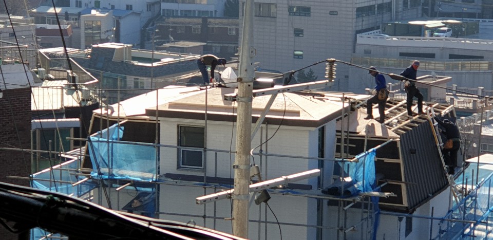 서울시 용산구 이태원동. 아스팔트싱글로 덮여있던 지붕 및 데스리를 V-250징크로 시공한 사례.