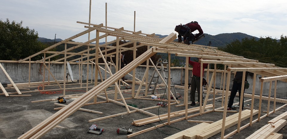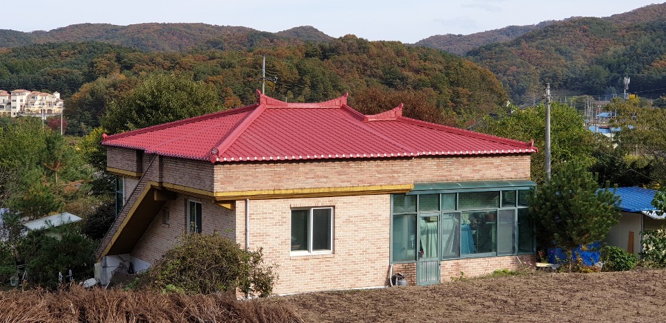 강원도 홍천군 한치골. 슬라브지붕위 투바이와 정재로 상을 짠 다음 칼라강판 평기와골로 개량공사.