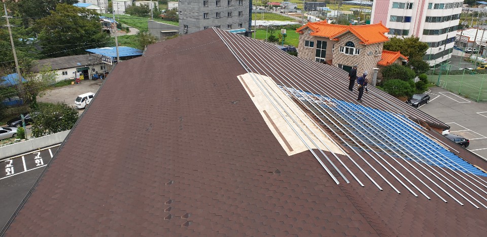 화성시 송산면 사강리. 태풍으로인해 아스팔트 싱글로 덮인 교회지붕이 날아가 아연C형강으로 날줄을 걸고 칼라강판 평기와골로 개량공사.