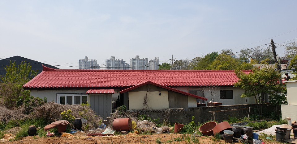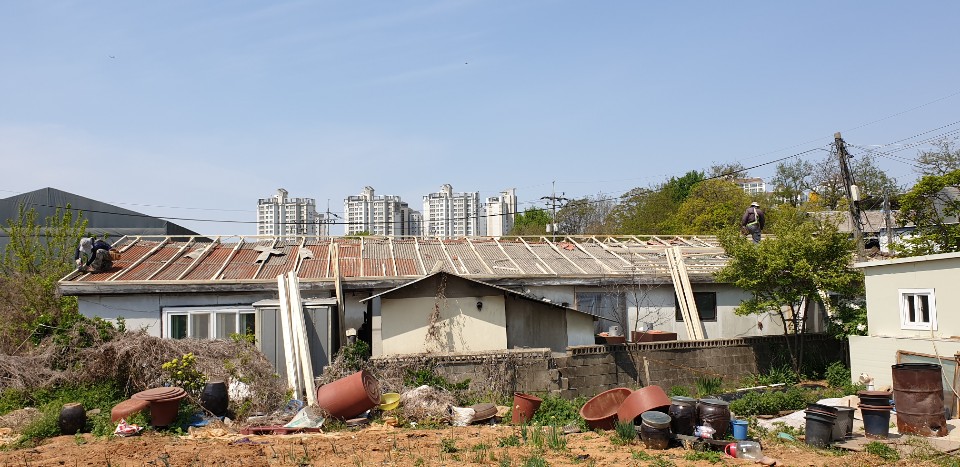 인천시 서구 왕길동. 기존 슬레이트 지붕을 철거하지않고 칼라강판 기와형으로 지붕개량
