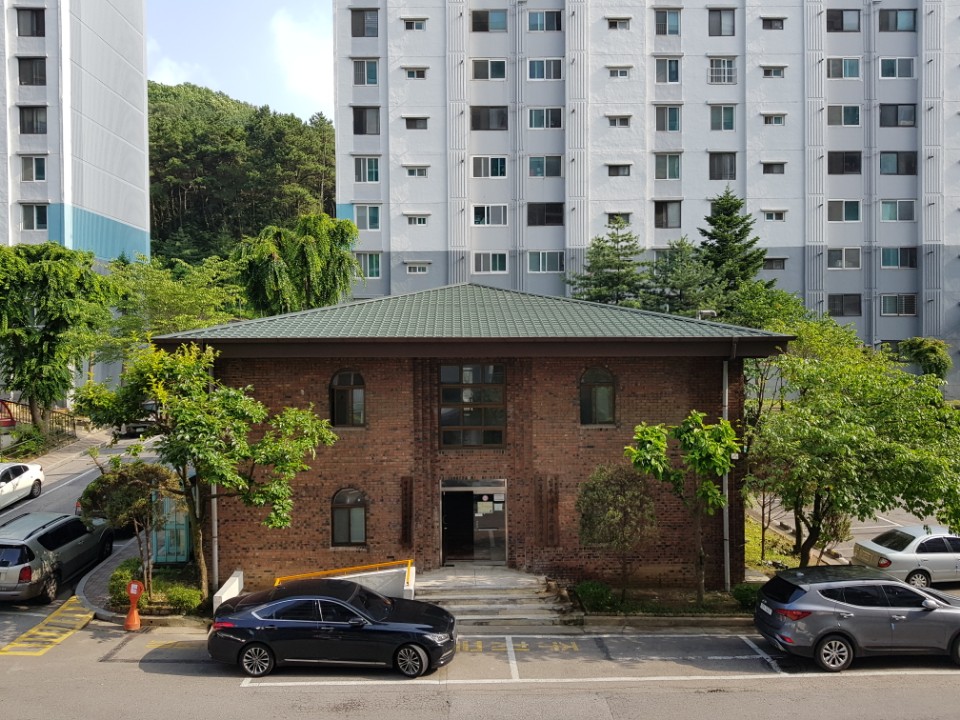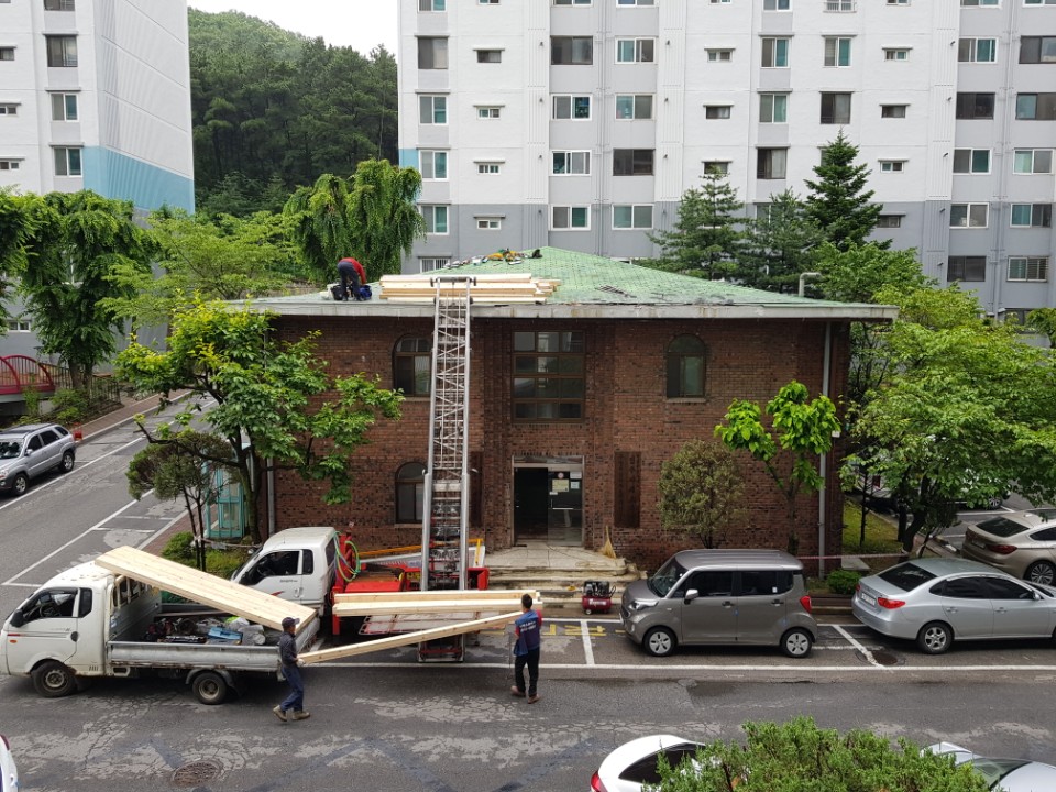 안양시 박달동 고야슬라브에 싱글로 덮여있던 아파트 관리사무소의 지붕이 노후돼 칼라강판 평기와골로 개량공사