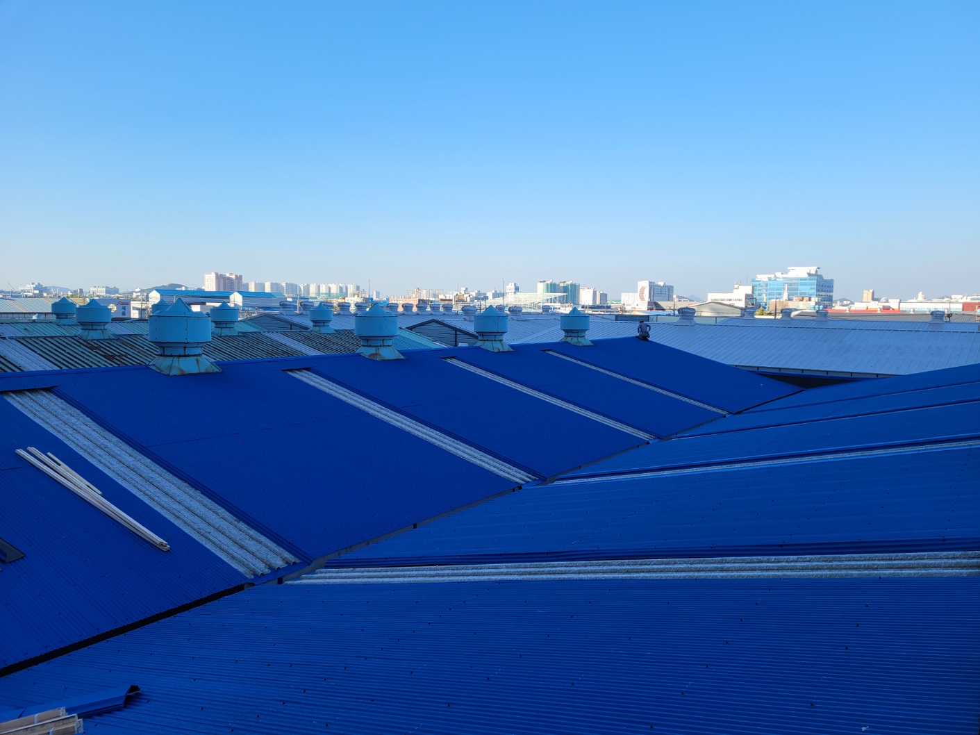 시흥시 정왕동. 기존의 노후된 V250 홑강판위에 정재각재로 하지작업후 아연도 칼라강판 슬레이트골로 지붕개량함.