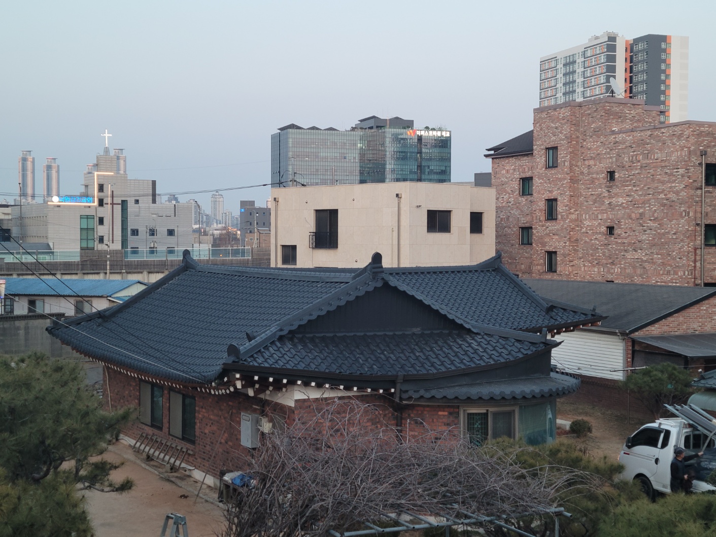 오산시 세교동. 기존의 한옥기와를 철거하지않고 정재,각재로 상을 짠후 아연도칼라강판 전통기와 대골로 덧방 시공함.