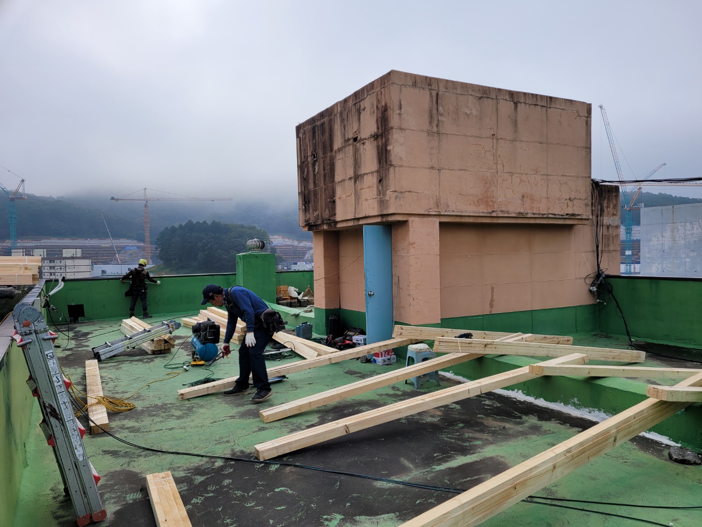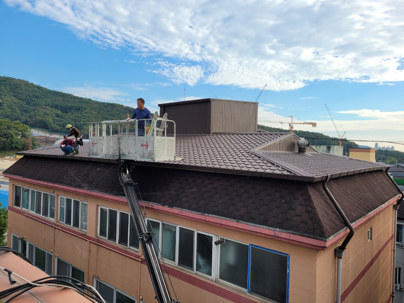 용인시 모현읍. 비가 새는 슬라브지붕을 방수와 단열 목적으로 칼라강판 평기와골로 개량공사함.