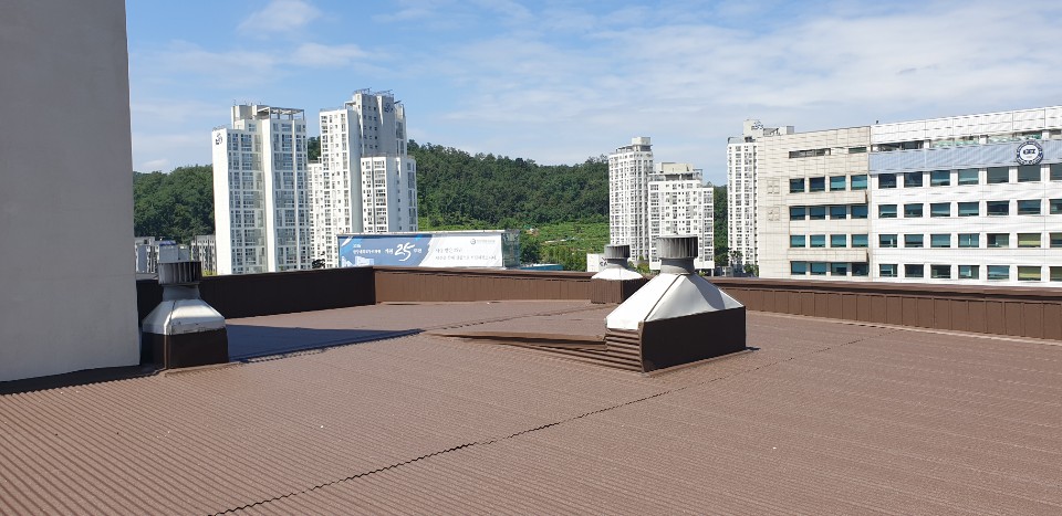 구리시 교문동. 오피스텔 10층 슬라브지붕을 밟고 다닐수 있도록 칼라강판 슬레이트골을 사용해 바닥시트형으로 시공함.