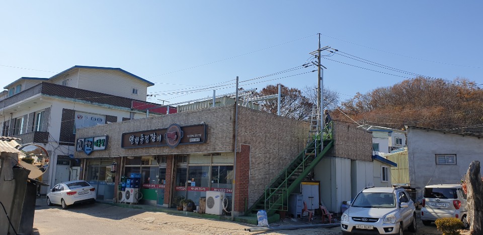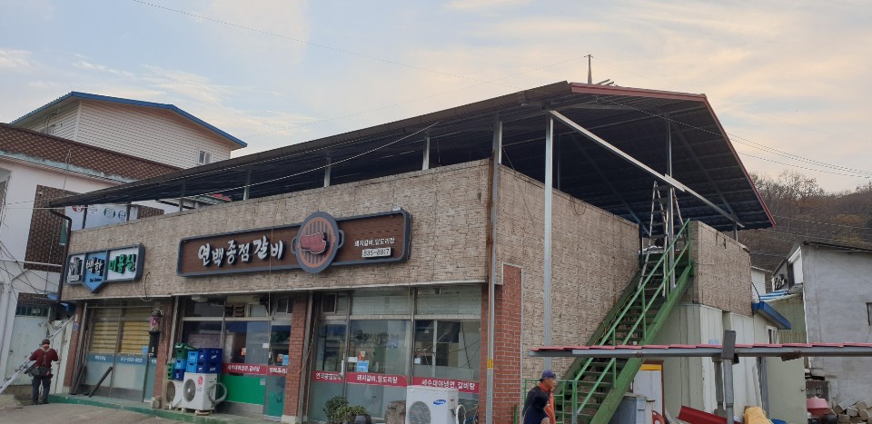 연천군 백학면. 상가 슬라브지붕의 방수 및 옥상 공간 활용이 가능하도록 아연각파이프로 보를 세운 뒤, 그 위로 아연도칼라강판을 덮어 시공함.