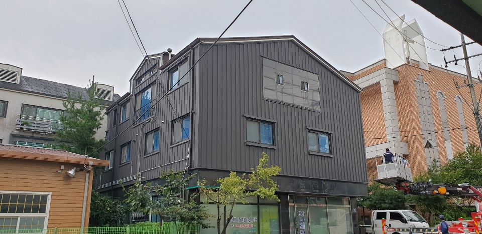 인천 서구 경서동. 비가 오면 빗물이 스며들던 현무암 외벽을 V250칼라아연도강판으로 깔끔하게 시공함.