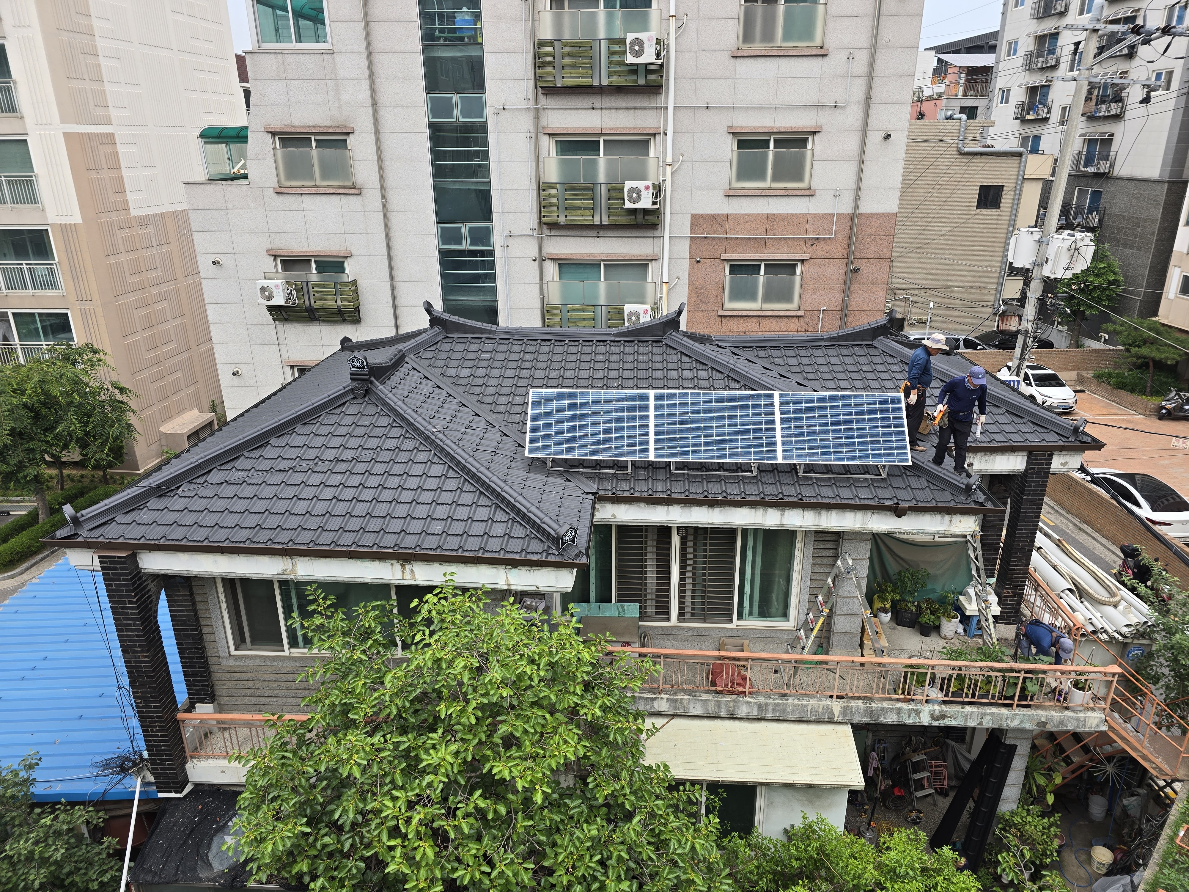 서울시 장안동. 고야슬라브지붕위의 태양광모듈을 해체후 칼라강판으로 지붕시공후 다시 부착함.